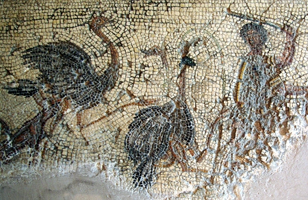 Plus loin, un onagre agonise, transpercé par un épieu (venabulum) ; des flots de sang coulent sur le sable, de ses flancs et de ses narines. |