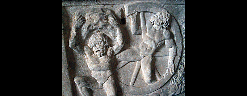 Détail du sarcophage de Protésilas représentant les damnés Sisyphe et Ixion dans le Tartare