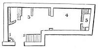 Au-dessous est le plan d'une cuisine de la même ville, dans la maison du questeur, qui se compose des parties suivantes : immédiatement à main gauche de l'entrée il y a un évier demi-circulaire (1), et à droite un escalier (2) qui menait probablement à l'office aux provisions ; en face de l'entrée sont les restes du briquetage qui formait le fourneau (3), construit de la même manière que celui que nous avons donné ci-dessus ; attenant à cette pièce est une autre petite chambre (4) qu'on pourrait appeler arrière-cuisine, avec des lieux d'aisance (5) tout à fait à l'extrémité ; chose assez singulière, les latrines se trouvent en général à coté des cuisines dans les maisons de Pompéi.