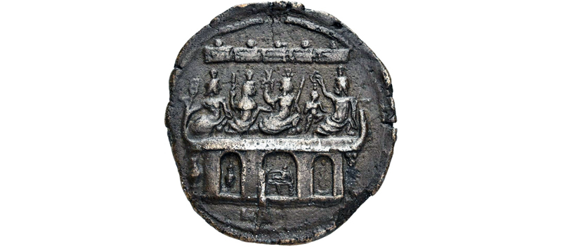 De gauche à droite : Sérapis, Harpocrate, Isis, Déméter et Hermanubis - Berlin 136/1936 - Münzkabinett Museum, Berlin