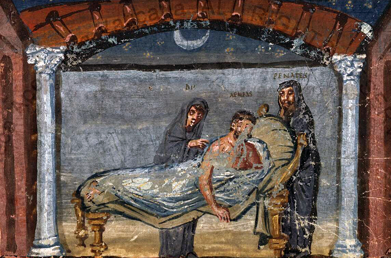 Les pénates de Troie apparaissent en songe à Enée - Enluminure du manuscrit dit Vergilius Vaticanus -