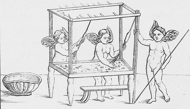 Voyez les deux gravures au mot infulatus, où cette ressemblance est fort sensible, quoiqu'il soit évident, en y regardant de près, qu'elles représentent les mêmes objets que la gravure ci-jointe, qui montre deux génies faisant des infulae, d'après une peinture découverte à Retina. La quantité de flocons attachés ensemble pour faire une longueur explique aussi pourquoi les écrivains en prose emploient le plus souvent ce mot au pluriel. |