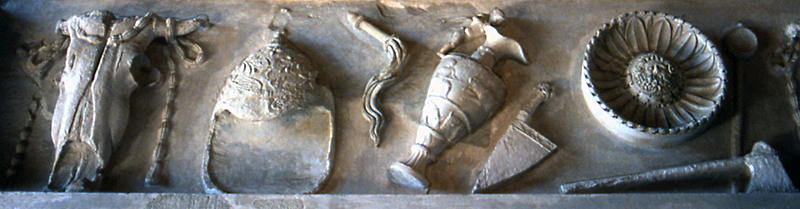 Entablement du temple de Vespasien représentant de gauche à droite un bucrane, un bonnet de flamine, un aspersoir, une cruche,