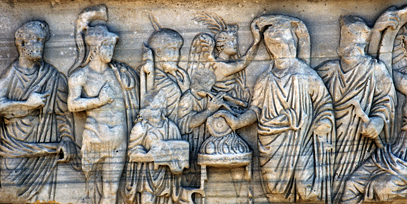 Base des Decennalia (303 apr.JC) représentant de gauche à droite : un membre du Sénat, le dieu Mars, le flamen Martialis reconnaissable