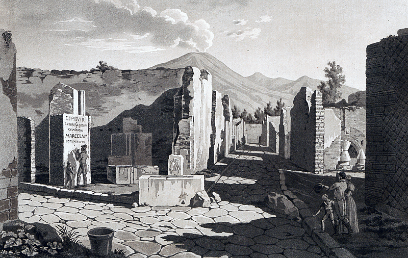 A cet endroit, il y a toujours une fontaine dans la ville de Pompéi, comme on le voit dans notre specimen, qui présente une vue d'une des rues de cette ville.