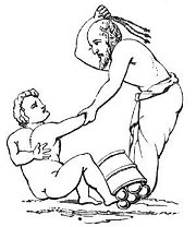 - Verges, ou fouet avec plusieurs cordes tortillées et nouées comme les nombreuses antennes du polype, qui sont désignées par le même nom (Ov. Met. IV, 367) ; il servait principalement pour châtier les esclaves (Juv. VI, 478 ; Hor. Sat. I, 2, 41 ; 3, 119 ; Marcell. Dig. 48, 19, 10). Quoique le mot soit un diminutif de flagrum, ce fouet était en réalité beaucoup plus dur ; le diminutif en effet ne s'applique qu'à la finesse des fibres qui le composaient, mais cette finesse même augmentait la douleur des coups. Aussi est-il caractérisé par l'épithète horribile. Dans certains cas, il donnait la mort (Hor. ll.cc.) Les blessures qu'il faisait sont toujours exprimées par des mots qui indiquent l'action de couper, ainsi caedere, secare, scindere (Hor. Juv. Il. cc.; Ov. Ibis, 183), par opposition à ceux qui accompagnent flagrum et qui expriment l'action de frapper lourdement ou avec force, comme pinsere ou rumpere. Le fouet tenu par le personnage qu'on voit debout dans la gravure, et copié d'après l'anse d'un pot de bronze trouvé à Pompéi, représente sans doute un de ces instruments ; mais on concevra facilement que la figure est trop petite pour donner une idée réelle de l'objet.