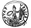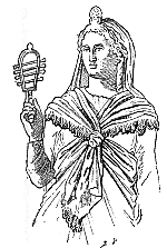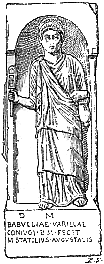 Nous possédons un très grand nombre de monuments où sont représentées des dames isiaques ; elles portent toujours le costume et les attributs de leur déesse, si bien qu'il est quelquefois difficile de décider si l'on a affaire à une image divine ou à un portrait ; sur les monuments de l'Empire, cependant, les dames affiliées au culte d'Isis sont plus facilement reconnaissables à leur coiffure étagée suivant la mode de leur temps, et leur visage a souvent un caractère individuel, ou du moins l'artiste a fait effort pour imiter leurs traits véritables. Le bas-relief ci-joint représente une dame romaine, Babullia Varilla, femme d'un augustale, qui fut initiée aux mystères d'Isis, comme l'indiquent le sistre dans sa main droite et le petit seau dans la gauche. | ![]() |