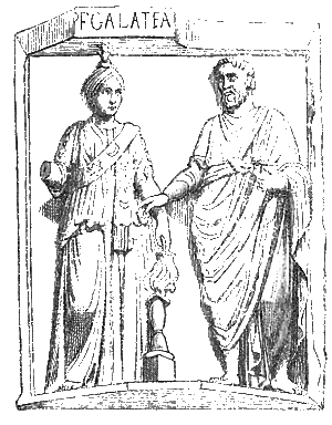 La figure ci-dessus reproduit un bas-relief de Rome, où une isiaque du nom de Galatea est représentée avec son mari ; elle porte sur sa poitrine un insigne tout à fait remarquable ; c'est une sorte d'étole, ornée d'étoiles et de croissants. Les hommes qui acceptaient des fonctions sacerdotales devaient se raser complètement les cheveux et la barbe, porter un vêtement de toile et se soumettre à certains principes d'abstinence. Cette nécessité du reste n'était pas incompatible avec l'exercice d'une profession ; lorsque le héros d'Apulée a passé par tous les degrés de l'initiation, il entre dans la confrérie des pastophores, où il est élevé bientôt à la dignité de décurion quinquennal ; à partir de ce jour, il se fait raser la tête : «Loin de chercher à couvrir ou à dissimuler sa calvitie, il se présentait à tous les regards avec allégresse» ; or, il était en même temps avocat. Dans l'Isium de Pompéi, on a trouvé le buste en bronze d'un certain C. Norbanus Sorex, qui a dû y remplir quelque sacerdoce ; il est entièrement dépourvu de cheveux. Quelquefois les Isiaques réservaient seulement sur leur tête rasée une longue mèche, qu'ils laissaient pendre du côté droit ; on peut voir à l'article Ferrum un forgeron de Sens qui avait adopté ce mode de coiffure.