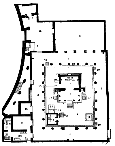 Nous avons dans l'Isium de Pompéi un exemple très curieux des temples qui furent consacrés hors de l'Egypte aux divinités alexandrines. Sur l'emplacement de cet édifice, il y en avait un autre plus ancien ; il avait été construit au IIe siècle av. J.-C. ; le tremblement de terre de l'an 63 l'avait renversé. Celui dont les ruines sont encore debout se compose d'un naos (6) prostyle tétrastyle (5), précédé d'un escalier de sept marches ; ce naos occupe le centre d'une cour (4) entourée d'un portique (3). Plusieurs autels se dressent le long de la colonnade (10) ; dans un coin on remarque une édicule (1) conduisant à un petit caveau (13), destiné peut-être aux incubations sacrées, et en face une construction carrée (11) dont on n'a pu jus-qu'ici déterminer l'usage. En arrière du temple est une salle (15), communiquant avec la cour par cinq arcades ; c'était sans doute la schola, où s'assemblait le collège des Isiaques pour ses délibérations et ses banquets. Plus loin vient une pièce qui devait servir de trésor (16) ; à l'extrémité opposée, on peut reconnaître le logement du gardien, et peut-être de quelques prêtres, dans un ensemble de petites chambres, comprenant une salle à manger, une cuisine et une cage d'escalier (18 à 22). Mais ce qui fait surtout l'intérêt du monument, ce sont les peintures qui décoraient les murs, et les nombreux objets relatifs au culte isiaque qu'on y a découverts ; il suffit d'en parcourir la description pour comprendre comment les adorateurs des dieux alexandrins mêlaient l'art de l'Egypte à celui de la Grèce. A côté de figures dont tous les traits sont empruntés à la mythologie hellénique, on a recueilli dans ce lieu et transporté au musée de Naples plusieurs statuettes égyptiennes et trois tables couvertes d'hiéroglyphes. Dans la ville de Rome, il y avait à la fin de l'Empire sept temples consacrés à Isis et à Sérapis ; le plus important, celui dont nous connaissons le mieux l'histoire, s'élevait au Champ de Mars, dans la IXe région, tout près du Panthéon d'Agrippa ; des fouilles pratiquées sur son emplacement à diverses époques, mais surtout celles qu'a dirigées M. Lanciani en 1883, ont rendu à la lumière un grand nombre de monuments de proportions beaucoup plus considérables que ceux de l'Isium de Pompéi. Dans le nombre on remarque des statues du Nil et du Tibre et d'autres figures de style gréco-romain, mais aussi des obélisques, des cynocéphales, des sphinx, qui remontent à l'époque pharaonique, comme l'attestent les hiéroglyphes sculptés à leur surface. Il est donc bien évident que les antiquités d'origine égyptienne qu'on retrouve partout dans le sol de l'empire romain ont été importées, comme nous le voyons à Pompéi et à Rome, pour servir d'objets de dévotion dans des temples ou des chapelles d'Isis, et non pas uniquement pour satisfaire la curiosité des amateurs d'objets exotiques.