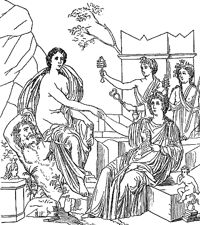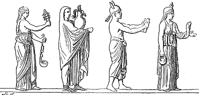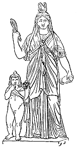 ![]() | Quelquefois on place un voile sur sa tête pour indiquer que la nature dissimule à l'homme ses secrets. Comme ses prêtres, Isis était «vêtue de toile», suivant la coutume égyptienne, d'où ses surnoms de linoplepos, linostolos, linigera. La figure à gauche reproduit une statue conservée au Musée du Capitole, à Rome, la figure à droite une statue de la glyptothèque de Munich : toutes deux offrent sous une forme élégante le type communément adopté par les artistes grecs. Mais, outre ses attributs propres, Isis en emprunta à certaines divinités, avec lesquelles elle a été plus spécialement mise en rapport. | ![]() |