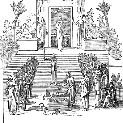 Apulée nous a laissé, dans le onzième livre des Métamorphoses, un curieux tableau des mystères d'Isis ; grâce à lui, nous pouvons constater qu'ils présentaient avec ceux d'Eleusis une étroite ressemblance [Eleusinia], quoiqu'il soit lui-même, suivant l'usage, très réservé sur la partie secrète de leur célébration. Son héros, Lucius, soudainement éclairé par la grâce d'Isis, a décidé de se faire initier dans le temple de Kenchrées, près Corinthe ; sur le conseil du grand prêtre, il y loue une chambre, et là il passe dans la retraite, dans les austérités et les pratiques de dévotion une période de recueillement. La date du grand jour lui est fixée par la déesse elle-même pendant son sommeil. Alors commence pour lui une suite de cérémonies, qui vont durer à peu près deux semaines ; nous y retrouvons toutes les péripéties des mystères éleusiniens. Ici aussi, l'initiation comprend une partie publique et une partie secrète, réglées l'une et l'autre par le mystagogue. D'abord a lieu, en présence d'un nombreux cortège, la purification par l'eau (katharsis) ; Lucius est conduit à une vasque voisine du temple, et le mystagogue, après avoir prononcé une prière, lui verse de l'eau sur le corps. On le ramène devant l'image d'Isis, où il reste prosterné. Vient ensuite un intervalle de dix jours, consacré au jeûne ; le néophyte se met en état de recevoir la grande révélation ; c'est la sustasis. Quand cette nouvelle période préparatoire est expirée, ses amis viennent lui apporter des présents dans le temple ; bientôt après, les profanes s'étant retirés, Lucius célèbre la grande veillée (pannuchis), la partie essentielle et décisive de l'initiation ; au milieu de clartés soudaines qui illuminent les ténèbres de la nuit, il assiste à des spectacles merveilleux, où sont condensés tous les secrets de la religion isiaque ; c'est proprement la muêsis. Le lendemain, au lever du soleil, on le donne en spectacle à la foule, revêtu d'un costume splendide, portant sur la tête une couronne de palmier et à la main une torche allumée. Pendant trois jours encore, il fête par des banquets son nouveau titre d'initié (mustês). Cependant, ce n'est pas tout encore ; il quitte Kenchrées et il se rend à Rome ; là, dans le temple alexandrin du Champ de Mars, il apprend qu'il peut aspirer à un degré supérieur de sainteté ; après un an révolu, il se fait initier aux mystères de Sérapis ; il devient epoptês.