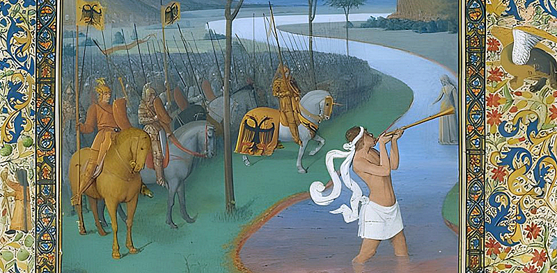 Alors qu'il hésitait, voici quel prodige lui apparut. Un homme, d'une taille et d'une beauté extraordinaires, assis à proximité, apparut soudain en jouant de la flûte ; comme, pour l'entendre, outre les bergers, la plupart aussi des soldats étaient accourus en quittant leurs postes et parmi eux aussi des sonneurs de trompe, ayant saisi l'une de leurs trompettes, il s'élança vers le fleuve et, avec un souffle énorme, ayant entonné la sonnerie guerrière, il se dirigea vers l'autre rive. |