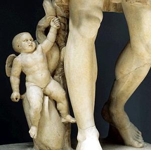 A ses pieds, un Cupidon chevauchant un dauphin rappelle d'une part l'ascendance divine qu'il revendique dans toute sa propagande, à la suite de Jules César, et d'autre part la victoire d'Actium, qui lui a assuré la suprématie et a mis fin aux guerres civiles.