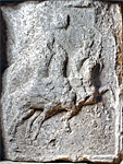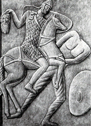 Dans son article de la Revue archéologique en 1971, Michael Speidel croit voir dans la figure humaine de la métope IV qui se dresse devant le cavalier (ci-dessus) un personnage en train de se trancher la gorge de sa main droite avec la sica, une dague recourbée typique de l'armement dace. Il lui semble être coiffé d'une coiffe en demi-globe, ce qui l'identifie comme un noble (pileatus) et pas un soldat ordinaire (comatus). Et l'emplacement de la métope dans une série qui évoque une course-poursuite le conduit à envisager qu'elle représente le moment du suicide de Décébale. Il faut cependant remarquer que la métope est brisée en deux et que la partie inférieure est manquante. Or si l'on en croit la reconstitution d'Eusebiu Mironescu (ci-contre), qui duplique le motif d'autres guerriers daces tombés à terre sur d'autres métopes, Décébale serait plutôt le personnage gisant et non pas celui qui, debout, s'appuie sur son bouclier... |