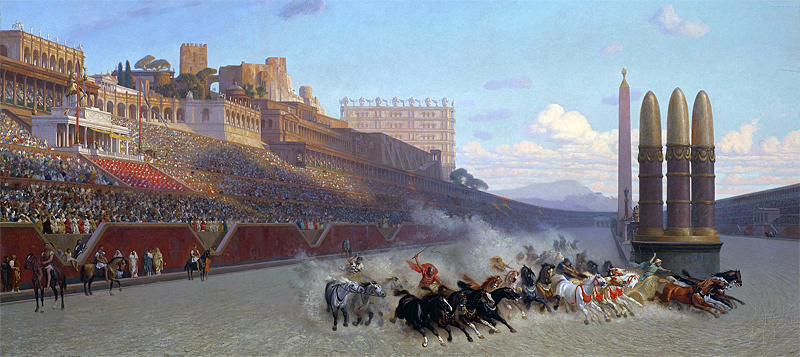 Il n'a pas fallu attendre l'établissement du régime du Principat et l'apogée de l'Empire romain sous la Pax romana pour que soient institués les jeux du cirque (ludi circenses) : bien au contraire, ces fêtes religieuses ET sportives remontent aux Grecs et aux Etrusques et sont donc antérieures aux origines mêmes de Rome. Le Circus Maximus, le plus ancien et le plus vaste hippodrome du monde romain, a été fondé en 599 av.JC par Tarquin l'Ancien, et a servi, au gré de ses multiples aménagements et reconstructions, jusqu'en 549 apr.JC, soit une utilisation ininterrompue de quasi-ment mille ans. Le succès de ces courses de chars tenait d'abord à leur caractère spectaculaire et dangereux : vous visionnerez les extraits du film Ben Hur de William Wyler en 1959 pour vous en faire une bonne idée. Mais le codage de couleurs (chevaux blancs pour le héros et noirs pour le méchant) et le parti-pris explicite des spectateurs juifs et arabes pour Ben Hur et romains pour Messala, s'il est fortement américanisé et romancé, nous renvoie tout de même à une autre réalité romaine puis byzantine : la répartition des attelages en quatre couleurs, vert, rouge, bleu et blanc, initialement destinées à célébrer le cycle des saisons mais devenues au fil du temps les signes de ralliement de groupes de partisans fortement politisés, qui n'hésitaient pas parfois à faire le coup de poing dans les gradins, comme de nos jours certains supporters lors de matches de football. Vous visionnerez les vidéos ci-dessous et lirez les documents complémentaires pour prendre la mesure de cette passion et de son rôle tout relatif dans la canalisation de la violence par ce genre de jeux.