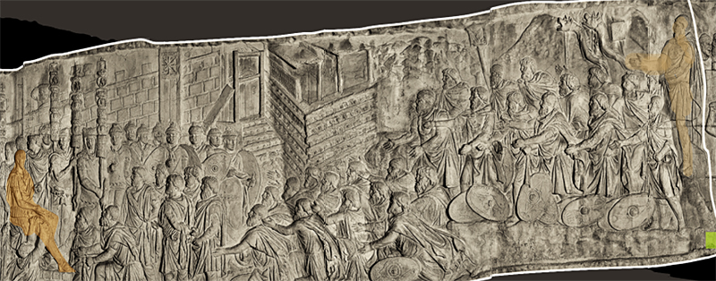 Or si l'on « dézoome » pour observer la totalité de la scène qui occupe un bon quart de spire, on constate que la soumission des Daces est en fait bien plus longue et consiste en un interminable défilé de personnages suppliants, soit agenouillés soit debout mais qui tous ont jeté leurs armes au sol et tendent les bras pour en appeler à la clémence de Trajan. A l'extrémité droite de la série, un personnage debout en hauteur observe la scène et esquisse du bras droit un geste d'accommodement, paume ouverte, mais avec un calme et une autorité manifestement royaux. Emil Panaitescu a d'ailleurs fait justement remarquer que cette composition d'ensemble fait écho à la première qui mettait en images, au cours de la bataille de Tapae, les deux chefs de guerre, Trajan à gauche et Décébale à droite, s'affrontant à distance mais reconnaissant leurs valeurs respectives, avec force et grandeur.