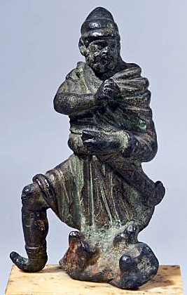 Cette petite statuette de bronze, d'une hauteur de 11,3 cm, a été acquise en 1865 par la Bibliothèque nationale de France et est conservée dans le Cabinet des Médailles et antiques. Elle figure au Catalogue des bronzes antiques de la Bibliothèque Nationale de E. Babelon et J.-A. Blanchet (1895), n° 911, et a été aussi dessinée dans le Répertoire de la statuaire grecque et romaine, Tome II, vol, I, 1897 de Salomon Reinach. La page web actuelle de la Bnf la décrit ainsi : « Figure d’applique représentant un guerrier barbu, le genou gauche posé au sol et la jambe droite pliée. Son corps est orienté vers la gauche, mais il tourne la tête vers la droite pour regarder derrière lui. Il est vêtu d’une tunique qui descend jusqu’aux genoux et d’un manteau noué sur l’épaule droite. Sa tête est couverte d’un chapeau conique. Sa main droite est ramenée vers l’arrière à hauteur de son épaule gauche, tandis que sa main gauche est posée sur la poignée de son épée suspendue à sa taille. Patine verte. » Cette statuette est d'origine inconnue, mais probablement gauloise d'après Constantin Petolescu qui le premier a proposé d'y voir une représentation du suicide de Décébale, en la rapprochant de celles des poteries sigillées de la Graufesenque qui suggèrent un sujet populaire, largement diffusé. Cette identification de C. Petolescu est reprise par D. Dana et A. Allély dans leur article sur « Les trois morts du roi Décébale » et à notre connaissance n'a pas été contestée depuis. |