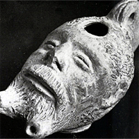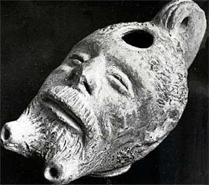 Le Musée national hongrois de Budapest possède une fort intéressante lampe à huile romaine en terre cuite, acquise en 1972 ; d'après les dires de sa propriétaire, elle avait été découverte dans les années 1930 dans une sablière, à Bükkipuszta, dans la commune de Kercseliget (comté de Somogy). Elle se trouvait dans une tombe romaine aujourd'hui disparue. Dimensions de l'objet : L. 11,5 cm, l. 6 cm, H. 7,8 cm Il s'agit d'une lampe à huile en forme de tête humaine, dont la grande ouverture sur le front servait à verser l'huile et les deux petites ouvertures aux deux bouts de la barbe laissaient passer les mèches. La localisation de sa découverte à Kercseliget situe l'objet en Pannonie romaine. |