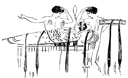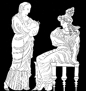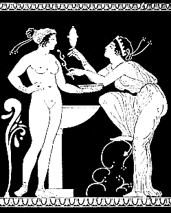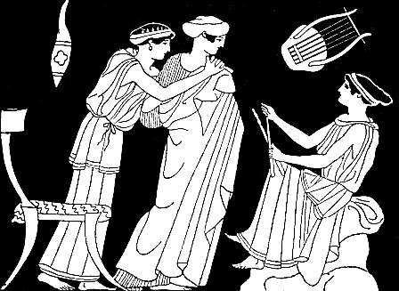 Le matin, on fit le repas de noces, dans la maison d'Acalanthis qu'elle avait adoptée pour mère. Mnasidika portait le voile blanc et moi la tunique virile. | ![]() |