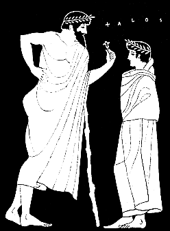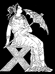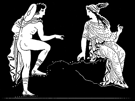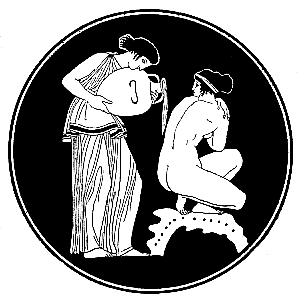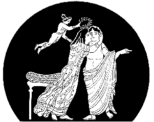 Ah ! par l'Aphrodita, te voilà ! tête de sang ! pourriture ! empuse ! stérile ! carcan ! gauchère ! digne de rien ! mauvaise truie ! N'essaie pas de me fuir, mais approche et plus près encore. | ![]() | Tu es Phoïnikienne : couche avec ceux de ta race. Pour moi, mon père était Hellène : j'ai droit sur tous ceux qui portent le pétase. Et même sur les autres, s'il me plaît ainsi. |