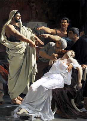 Presque exactement contemporain d'Octave Auguste, Tite Live le Pompéien est pourtant resté républicain dans l'âme et exalte dans son Histoire de Rome depuis sa fondation (Ab Urbe condita libri) les hauts faits et les valeurs de ceux qui ont donné à Rome sa grandeur. C'est particulièrement le cas, dès le livre I, dans l'épisode de Lucrèce, la vertueuse matrone violée par le fils du dernier roi étrusque et dont le suicide serait à l'origine de la fondation de la République romaine en 509 av.JC. Les circonstances tragiques du renversement de la royauté semblent bien légendaires, mais la typologie des personnages obéit au projet moralisateur d'un historien qui ne manquera pas de valoriser les représentant(e)s du mos majorum, tout autant qu'il stigmatisera ceux qu'il tiendra pour responsables d'une décadence dont Salluste avant lui, puis Juvénal, sont aussi les critiques. |