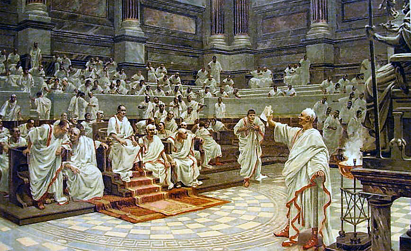 Chromolithogravure d'une illustration du XIXe s. représentant l'intervention de Cicéron au Sénat pendant l'Affaire Catilina