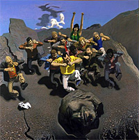 Sisyphe exubérant avec les siens Huile sur contreplaqué de Wolfgang Mattheuer - 1976 |