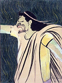 Portrait-charge de Mounet-Sully dans Œdipe-Roi (1899) à mi-corps en toge