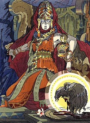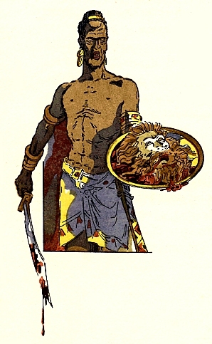 La tête entra ; et Mannaëi la tenait par les cheveux, au bout de son bras, fier des applaudissements.