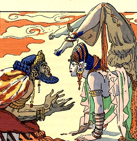 Les panneaux de la tribune d'or se déployèrent tout à coup ; et à la splendeur des cierges, entre ses esclaves et des festons d'anémone, Hérodias apparut, - coiffée d'une mitre assyrienne qu'une mentonnière attachait à son front ; ses cheveux en spirales s'épandaient sur un péplos d'écarlate, fendu dans la longueur des manches. Deux monstres en pierre, pareils à ceux du trésor des Atrides, se dressant contre la porte, elle ressemblait à Cybèle accotée de ses lions ; et du haut de la balustrade qui dominait Antipas, avec une patère à la main, elle cria :