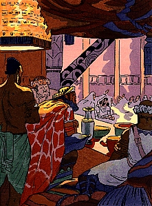 Plusieurs causaient debout, au milieu de la salle ; et la vapeur des haleines avec les fumées des candélabres faisait un brouillard dans l'air. Phanuel passa le long des murs.