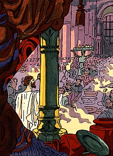 La table proconsulaire occupait, sous la tribune dorée, une estrade en planches de sycomore. Des tapis de Babylone l'enfermaient dans une espèce de pavillon.