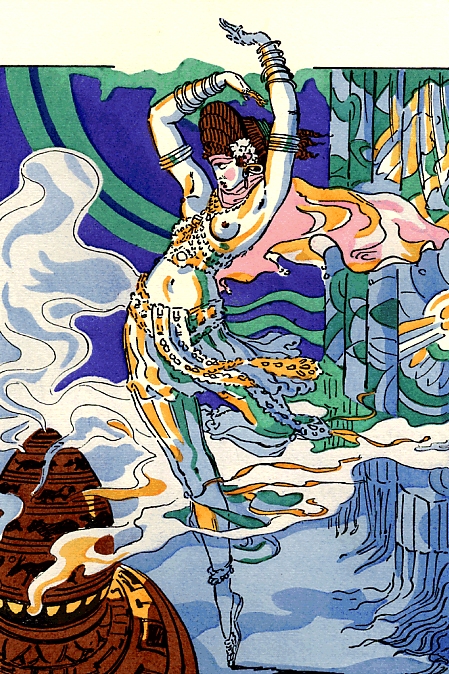 Elle se jeta sur les mains, les talons en l'air, parcourut ainsi l'estrade comme un grand scarabée ; et s'arrêta, brusquement. Sa nuque et ses vertèbres faisaient un angle droit. Les fourreaux de couleur qui enveloppaient ses jambes, lui passant par-dessus l'épaule, comme des arcs-en-ciel, accompagnaient sa figure, à une coudée du sol. Ses lèvres étaient peintes, ses sourcils très noirs, ses yeux presque terribles, et des gouttelettes à son front semblaient une vapeur sur du marbre blanc. | ![]() |
