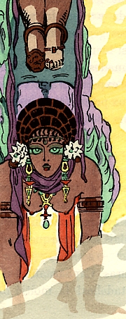 Sous un voile bleuâtre lui cachant la poitrine et la tête, on distinguait les arcs de ses yeux, les calcédoines de ses oreilles, la blancheur de sa peau. Un carré de soie gorge-pigeon, en couvrant les épaules, tenait aux reins par une ceinture d'orfèvrerie. Ses caleçons noirs étaient semés de mandragores, et d'une manière indolente elle faisait claquer de petites pantoufles en duvet de colibri.