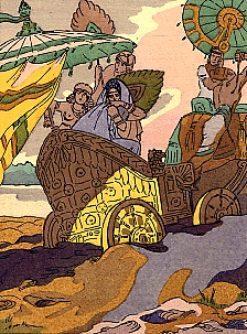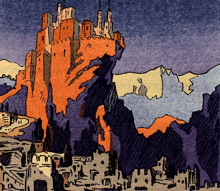 Il l'aperçut dans l'écartement de deux collines. Le soleil faisait resplendir ses murailles de marbre blanc et les lames d'or de sa toiture. C'était comme une montagne lumineuse, quelque chose de surhumain, écrasant tout de son opulence et de son orgueil.