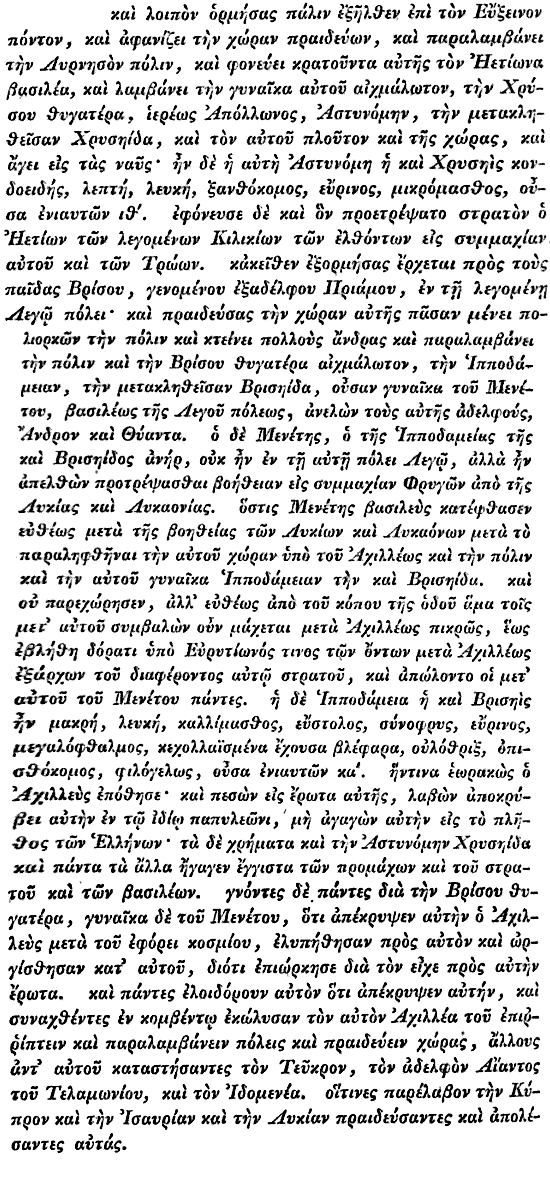 Dictis Ephemerides belli Troiani, passim[2,17] Caeterum Achilles haud contentus eorum quae gesserat Cilicas aggreditur ibique Lyrnessum paucis diebus pugnando cepit. Interfecto deinde Eetione, qui his locis imperitabat, magnis opibus naues replet, abducens Astynomen, Chrysi filiam, quae eo tempore regi denupta erat. Propere inde Pedasum expugnare occoepit, Lelegum urbem : sed eorum rex Brises ubi animaduertit in obsidendo saeuire nostros, ratus nulla ui prohiberi hostes aut suos satis defendi posse, desperatione effugii salutisque, attentis caeteris aduersum hostes, domum regressus laqueo interiit. Neque multo post capta ciuitas, atque interfecti multi mortales et abducta filia regis Hippodamia. Quintus de Smyrne, Posthomerica, III, 544-558