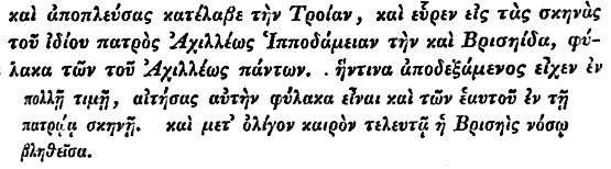 104. (Pyrrhus, qui et Neoptolemus) [...] solvens autem atque litus Troianum appulsus patris tentorium petivit, ubi Hippodamiam sive Briseidem rerum omnium quae Achillis fuerant custodem invenit. Hanc itaque amplexus summo habuit in honore eamque uti suis etiam in tentorio paterno prospiceret obtestatus est. Non longo autem post temporis Briseis in morbum incidens interiit. |