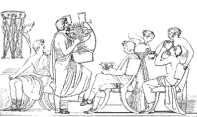 Et les Prétendants insolents entrèrent. Ils s'assirent en ordre sur des sièges et sur des thrônes : et des hérauts versaient de l'eau sur leurs mains ; et les servantes entassaient le pain dans les corbeilles, et les jeunes hommes emplissaient de vin les kratères. Puis, les Prétendants mirent la main sur les mets ; et, quand leur faim et leur soif furent assouvies, ils désirèrent autre chose, la danse et le chant, ornements des repas.