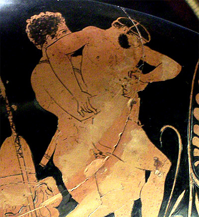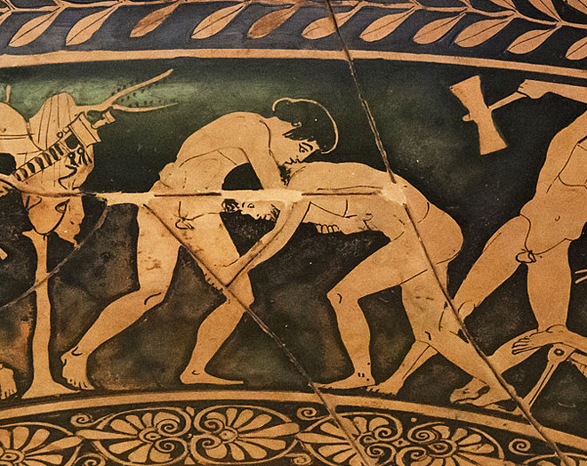 Son cinquième exploit eut lieu à Eleusis où il tua Cercyon, le fils de Branchos et de la Nymphe Argiopé. Cercyon obligeait tous les passants à le défier à la lutte, et il les tuait immanquablement : mais Thésée réussit à le soulever et à le fracasser contre terre. |