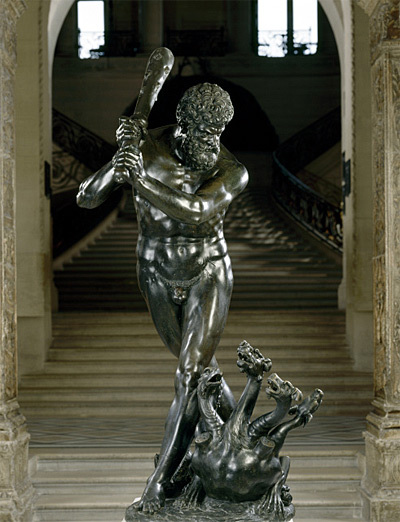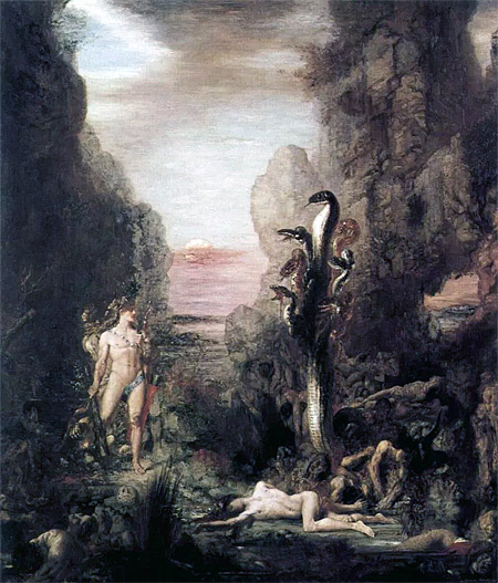 Bientôt la surface du marais se ride, l'eau se soulève et jaillit autour de la bête. Les neuf têtes serpentines surgissent des flots, bientôt suivies de l'énorme corps pareil à celui d'un serpent. Il rampe dans l'eau, repousse les roseaux qui bruissent et se brisent, enfin atteint la terre bourbeuse sur laquelle ondulent les anneaux et il s'avance, menacant, vers Héraclès. Il darde ses dix-huit yeux noirs vers Héraclès, qui s'est dissimulé derrière le bouclier. Lorsque l'hydre se redresse, les neuf cous supportent autant de têtes et s'attachent au tronc unique se trouvent à la hauteur du visage d'Héraclès. L'une des têtes s'avance vers lui, rapide comme la vipère qui saisit la mamelle d'une chèvre. Mais la lame de la divine épée a tournoyé et s'est abattue, plus vive encore : la tête, tranchée d'un seul coup, est tombée sur le sol et l'énorme mâchoire hérissée de dents venimeuses continue de s'ouvrir et de se fermer vainement. Ainsi Héraclès espère-t-il décapiter neuf fois le monstre et lui oter la vie qui s'échappe par le sang des blessures. Mais alors qu'il s'apprête à trancher une nouvelle tête, il voit que du cou se reforme, à partir du sang échappé, une nouvelle tête, et le monstre se retrouve dans son intégrité. En vain Héraclès frappe-t-il, en vain fait-il tomber les têtes tout en se protégeant des haleines mortelles : chaque fois repousse la tête. |