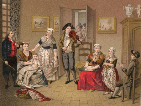 A cet habillement ordinaire, s'ajoutent, les jours de fête, la veste et les culottes à la française, les souliers à boucles, le chapeau ainsi que les bas. Les habits de cérémonie sont réalisés avec des étoffes grossières, toutefois adaptées à la mode citadine (5).
